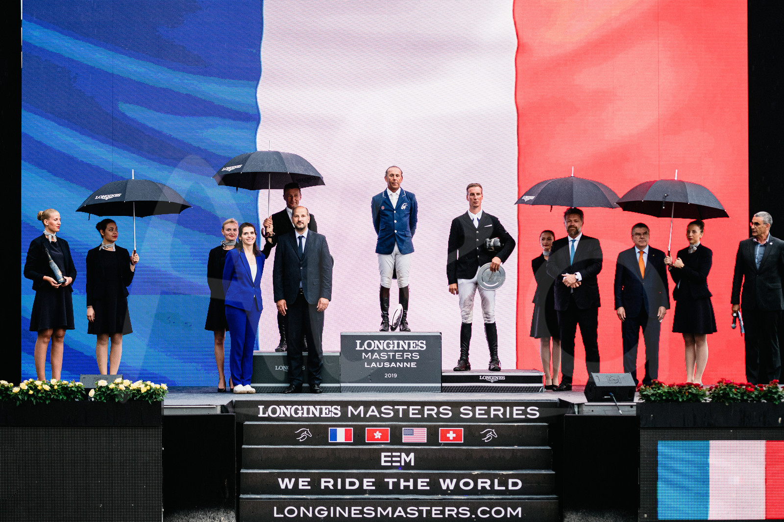 | Description | LAUSANNE, SWITZERLAND - JUNE 21, 2019 : Podium from left to right : Thierry Rozier, 2nd place, Philippe Rozier, winner, Alain Jufer, 3rd place,and officials from left to right : Gregoire Junod (Syndic of Lausanne), Christophe Ameeuw (PDG EEM), Thomas Bach (IOC President) after the Masters One - Ville de Lausanne during the Longines Masters Lausanne, on June 21, 2019 in Lausanne, Switzerland. (Photo by Jean-Louis Carli/ALeA/EEM) |