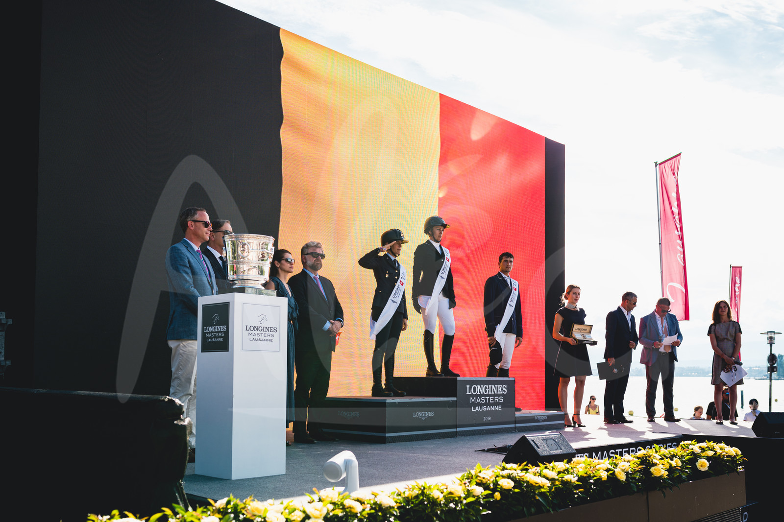 Description | LAUSANNE, SWITZERLAND - JUNE 23, 2019 : From left to right : Charles Villoz, Longines Sales Vice-President, Fernanda Ameeuw, Longines Masters ambassadress, Christophe Ameeuw, PDG EEM, Italian rider Giulia Martinengo, 2nd place, German rider Gudrun Patteet, winner, Belgian rider Nicola Philippaerts, 3rd place, are on the podium of the Longines Grand Prix of Lausanne at the Longines Masters Lausanne, on June 23, 2019 in Lausanne, Switzerland. (Photo by Alexis Anice/ALeA/EEM). |