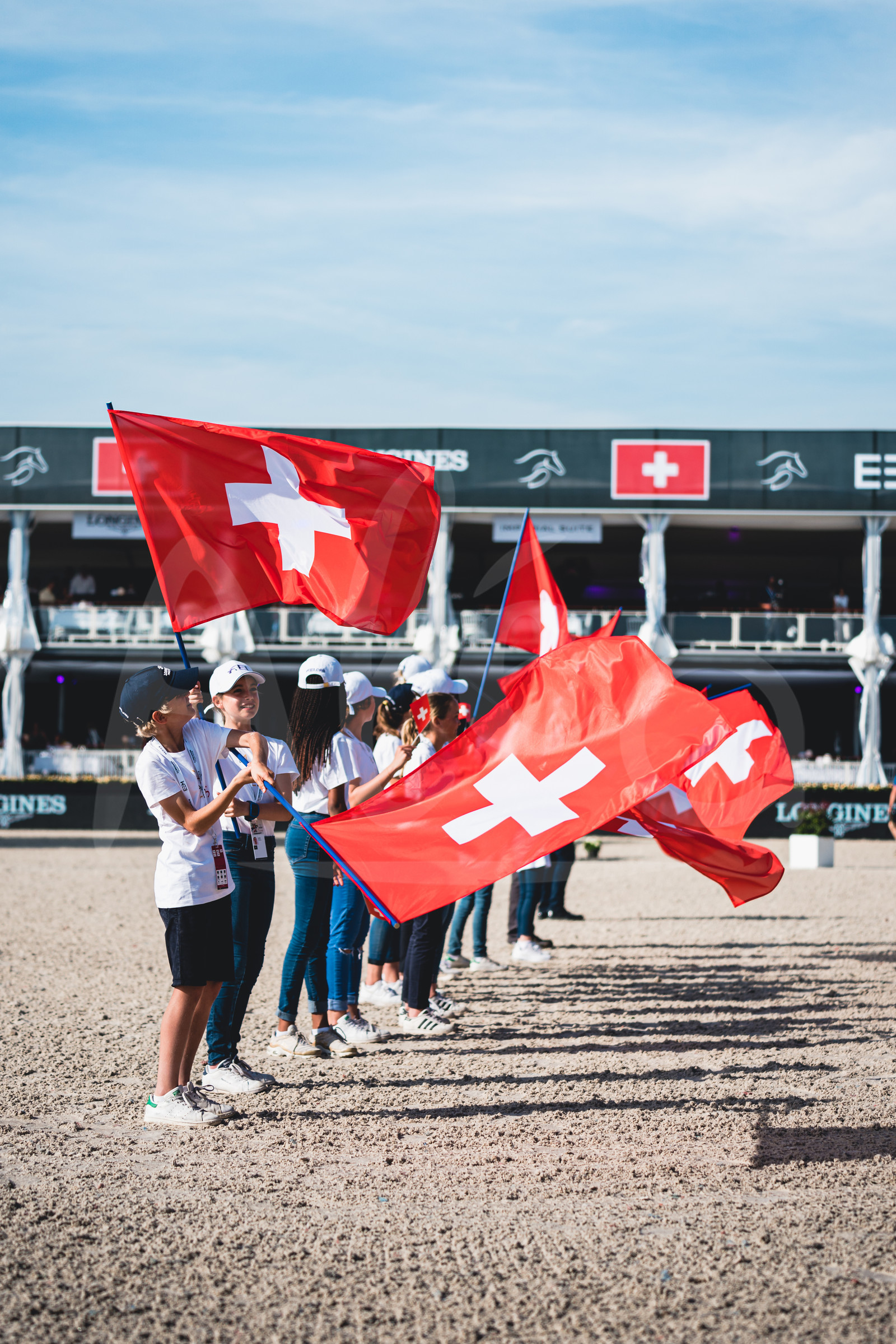 | Description | LAUSANNE, SWITZERLAND - JUNE 23, 2019 : Volunteers in the main arena with Swiss flags, after the Longines Grand Prix of Lausanne, at the Longines Masters Lausanne, on June 23, 2019 in Lausanne, Switzerland. (Photo by Jean-Louis Carli/ALeA/EEM). |