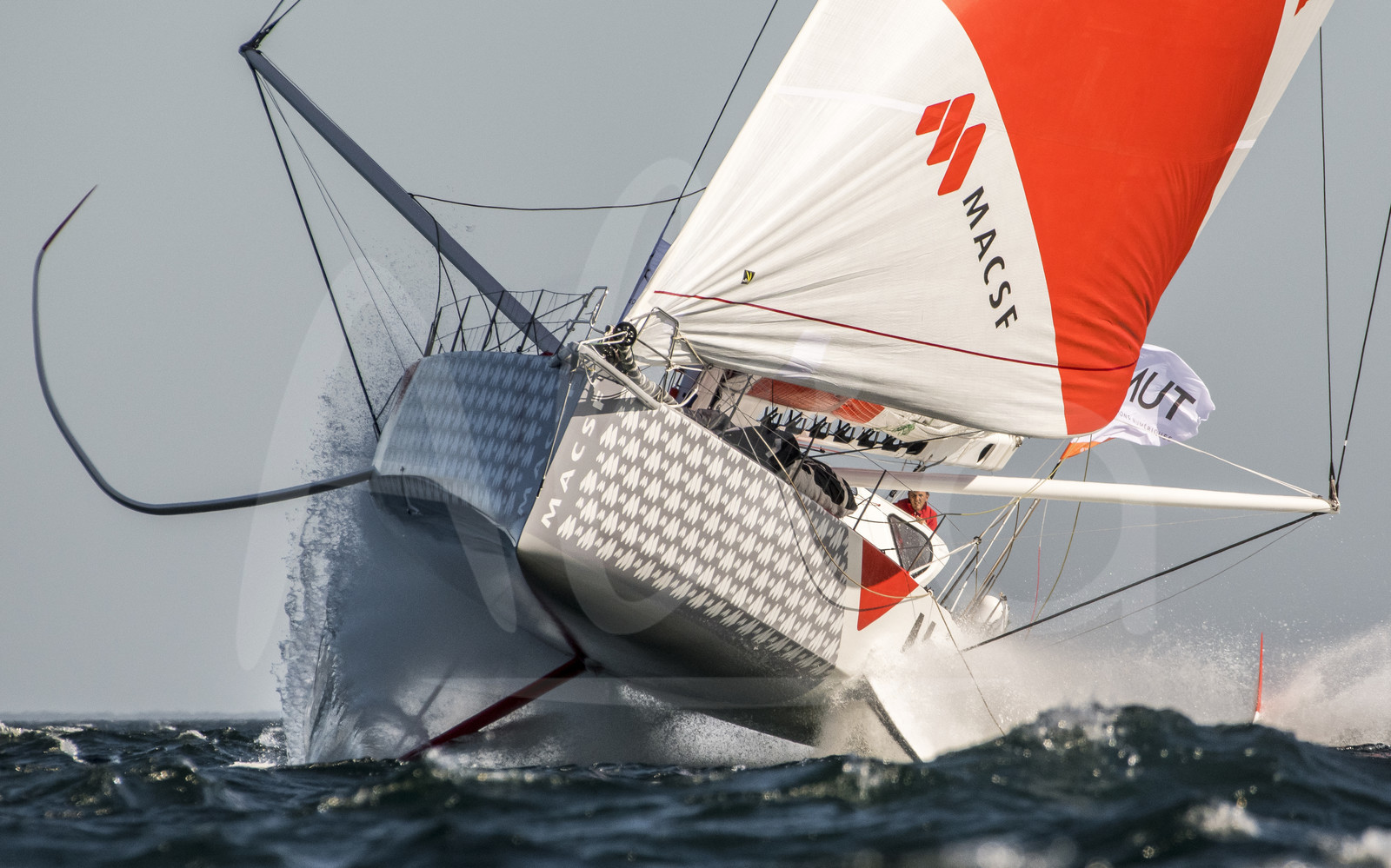 Description | OFF LORIENT, FRANCE, SEPTEMBER 18: Isabelle Joschke, Morgan Lagraviere and guests are sailing on MACSF during the Defi Azimut speed runs on September 18, 2019, off Lorient, France. (Photo by Vincent Curutchet/Alea) |