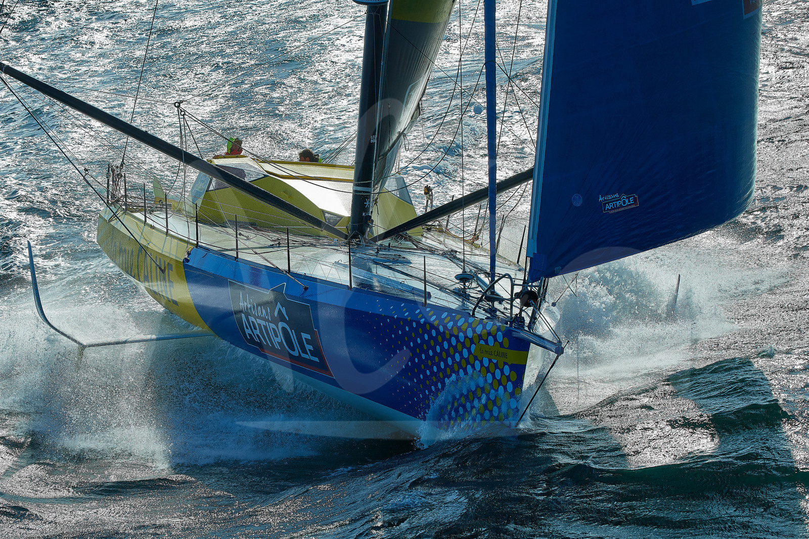 Description | OFF LORIENT, FRANCE - SEPTEMBER 19: French skippers Arnaud Boissieres and Xavier Macaire are training on the Imoca La Mie Caline - Artipole, prior to the Transat Jacques Vabre, sailing race in duo from Le Havre to Bahia, on September 19, 2019 off Lorient, France. (Photo by Yvan Zedda/Alea) |