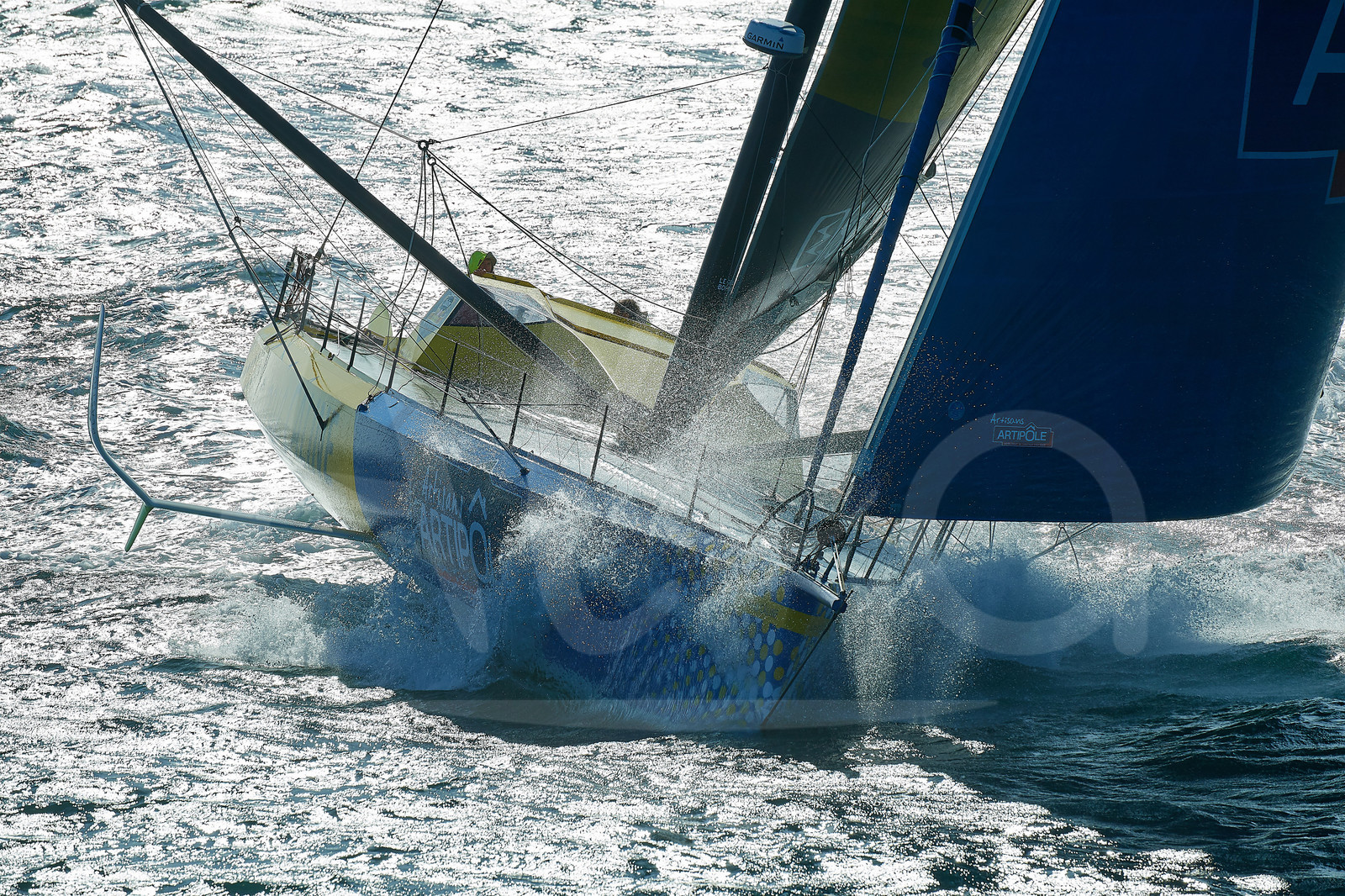 Description | OFF LORIENT, FRANCE - SEPTEMBER 19: French skippers Arnaud Boissieres and Xavier Macaire are training on the Imoca La Mie Caline - Artipole, prior to the Transat Jacques Vabre, sailing race in duo from Le Havre to Bahia, on September 19, 2019 off Lorient, France. (Photo by Yvan Zedda/Alea) |