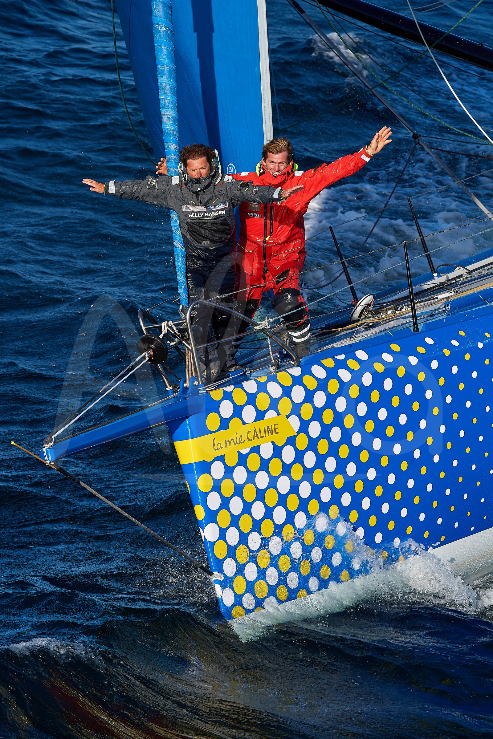 Description | OFF LORIENT, FRANCE - SEPTEMBER 19: French skippers Arnaud Boissieres and Xavier Macaire are training on the Imoca La Mie Caline - Artipole, prior to the Transat Jacques Vabre, sailing race in duo from Le Havre to Bahia, on September 19, 2019 off Lorient, France. (Photo by Yvan Zedda/Alea) |