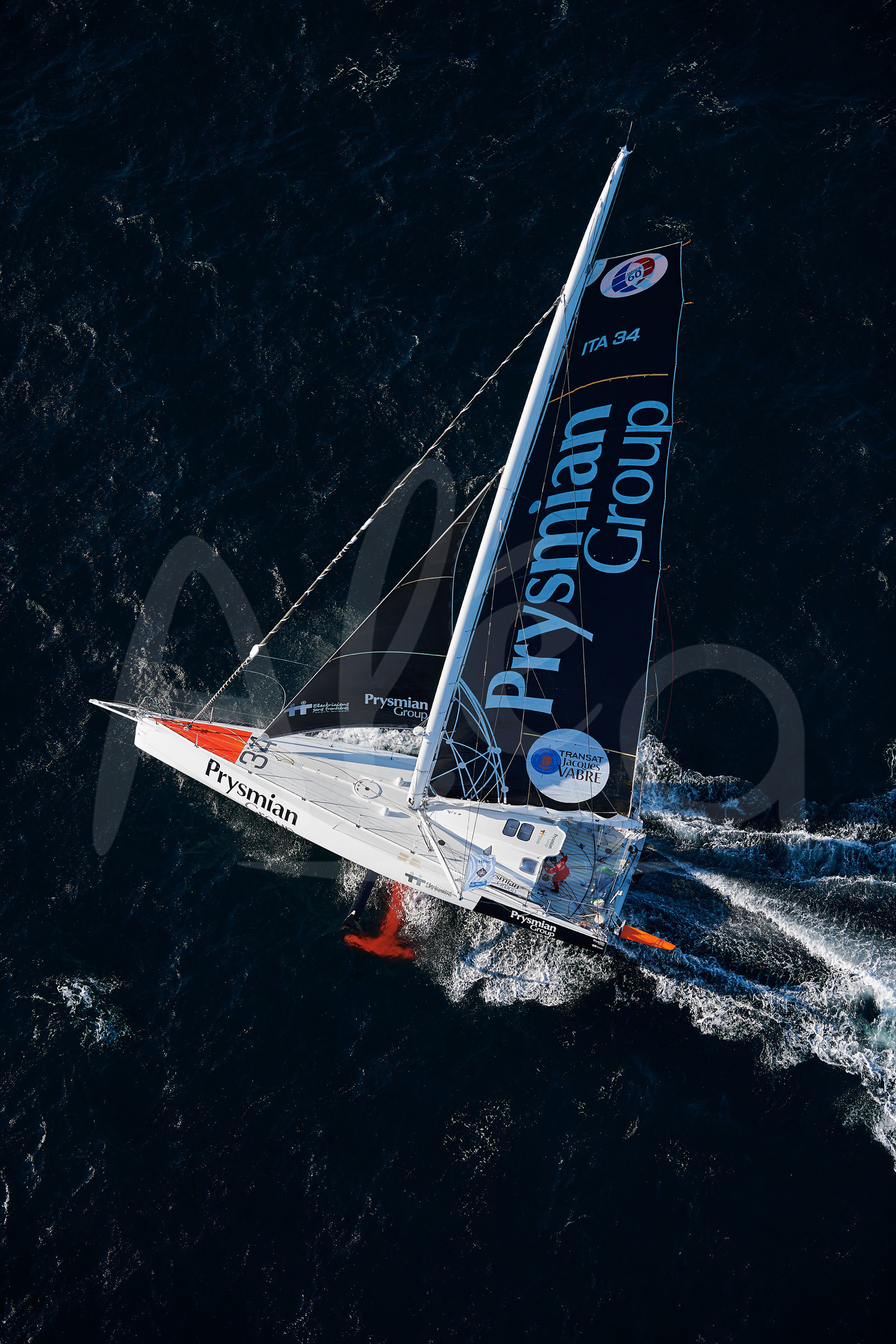 Description | OFF LORIENT, FRANCE - SEPTEMBER 19: Italian skipper Giancarlo Pedote and French Anthony Marchand are training on the Imoca Prysmian Group, prior to the Transat Jacques Vabre, sailing race in duo from Le Havre to Bahia, on September 19, 2019, off Lorient, France. (Photo by Yvan Zedda/Alea) |