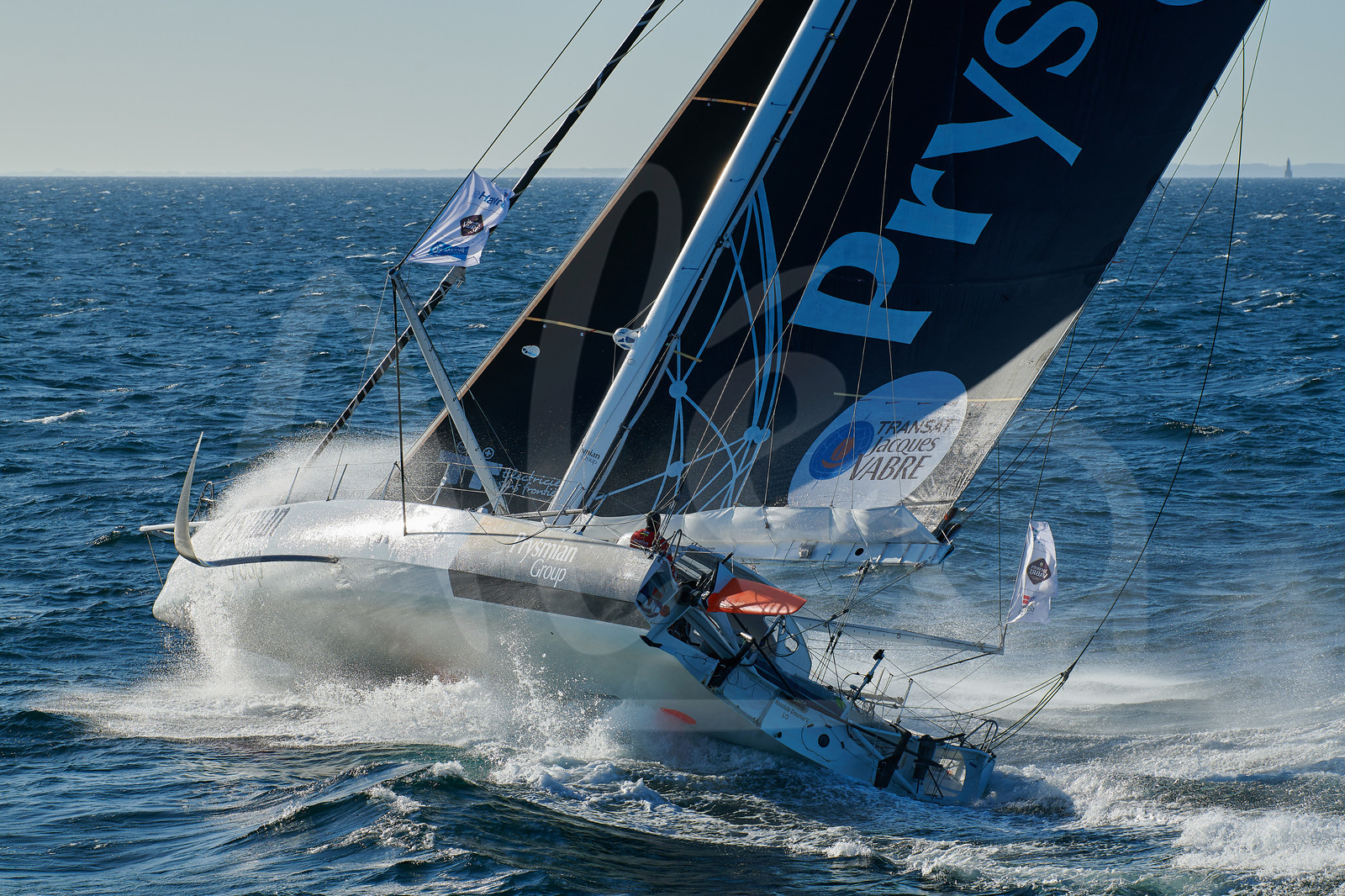 Description | OFF LORIENT, FRANCE - SEPTEMBER 19: Italian skipper Giancarlo Pedote and French Anthony Marchand are training on the Imoca Prysmian Group, prior to the Transat Jacques Vabre, sailing race in duo from Le Havre to Bahia, on September 19, 2019, off Lorient, France. (Photo by Yvan Zedda/Alea) |