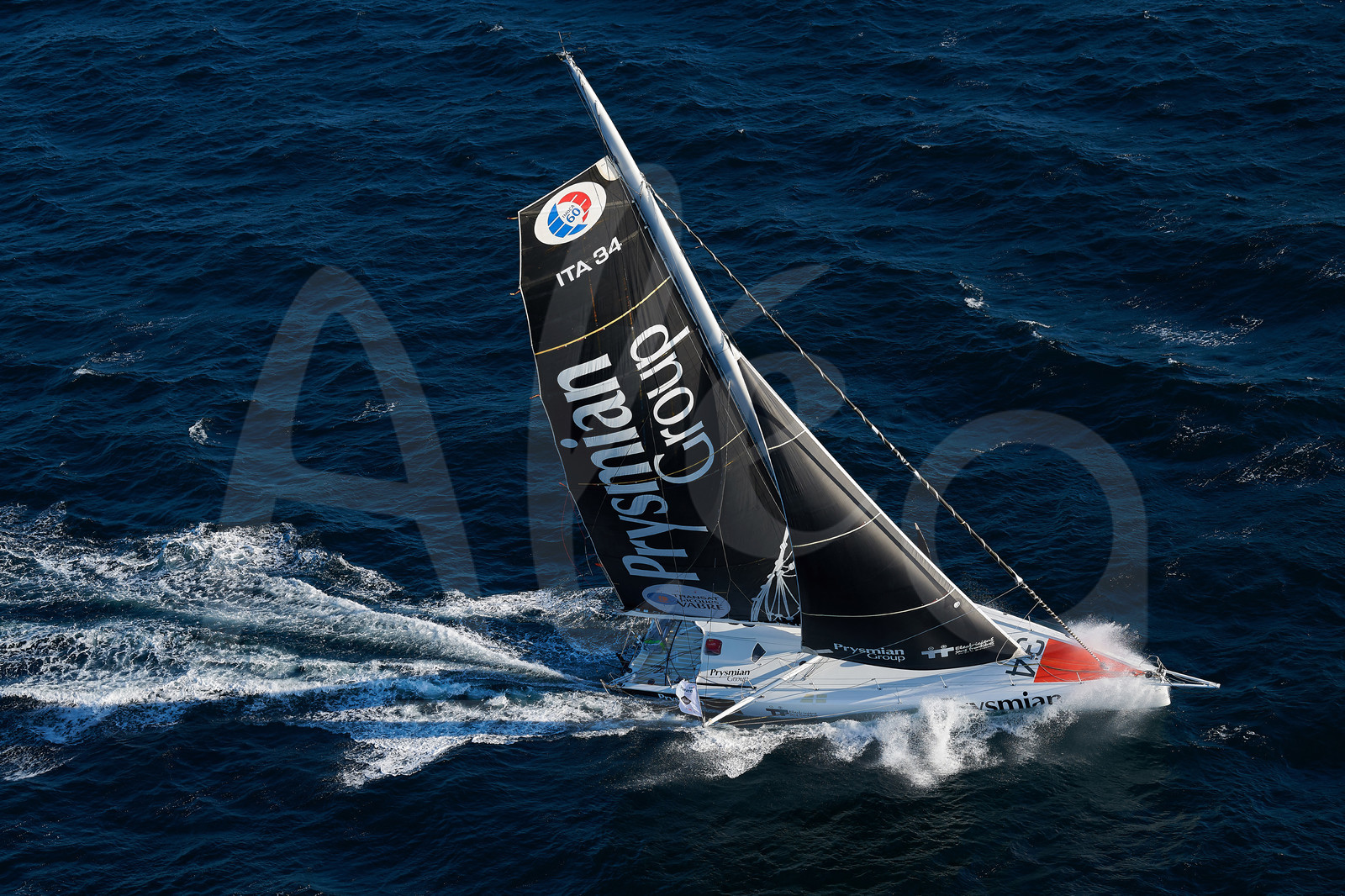 Description | OFF LORIENT, FRANCE - SEPTEMBER 19: Italian skipper Giancarlo Pedote and French Anthony Marchand are training on the Imoca Prysmian Group, prior to the Transat Jacques Vabre, sailing race in duo from Le Havre to Bahia, on September 19, 2019, off Lorient, France. (Photo by Yvan Zedda/Alea) |