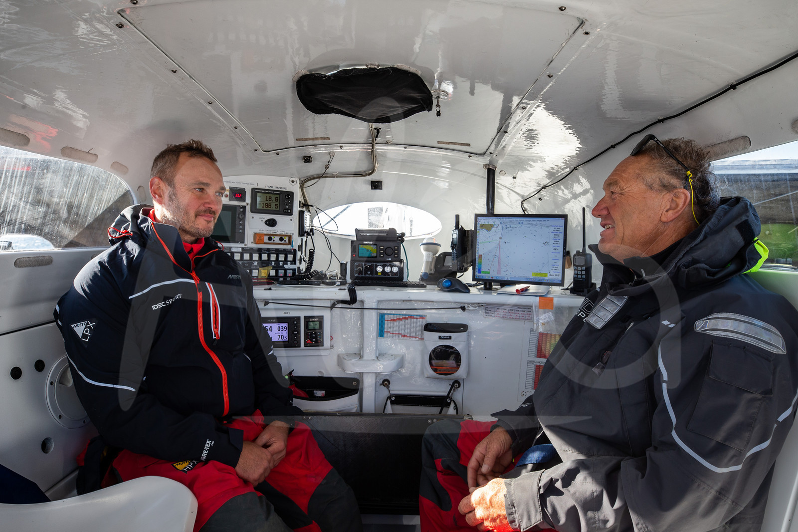 Description | OFF BELLE-ILE EN MER, FRANCE - SEPTEMBER 18: French skipper Francis Joyon is training onboard the Maxi Trimaran IDEC Sport with his crew, prior to their Asian Tour next winter on September 18, 2019, off Belle-Ile en Mer, France. Here Francis with Bertrand Delesne. (Photo by Jean-Marie Liot/Alea) |