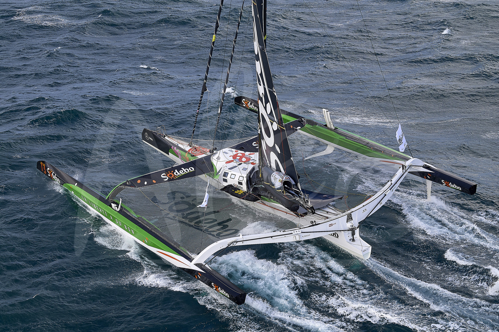 Description | BREST, FRANCE - NOVEMBER 05: Sodebo Ultim 3 is taking the start of the Brest Atlantiques duo sailing race on November 5, 2019 in Brest, France. Brest Atlantiques is reserved to Class Ultim 32/23, from Brest to Brest, via waypoints off Rio de Janeiro and Cape Town, without any stop. (Photo by Yvan Zedda/Alea) |