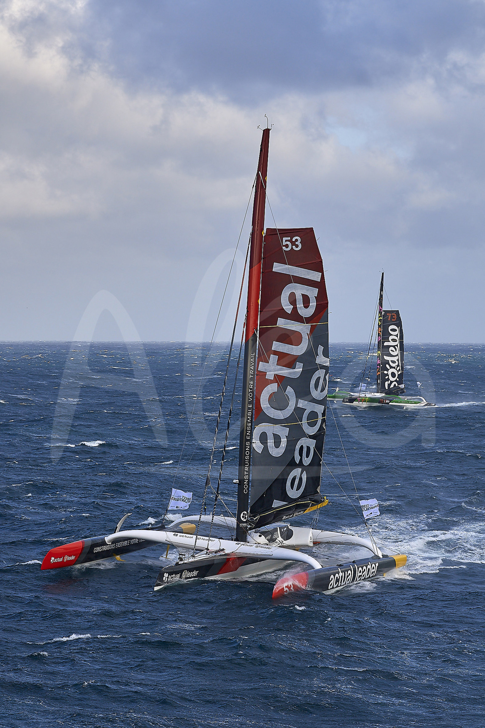 Description | BREST, FRANCE - NOVEMBER 05: Actual Leader and Sodebo Ultim 3 are taking the start of the Brest Atlantiques duo sailing race on November 5, 2019 in Brest, France. Brest Atlantiques is reserved to Class Ultim 32/23, from Brest to Brest, via waypoints off Rio de Janeiro and Cape Town, without any stop. (Photo by Yvan Zedda/Alea) |