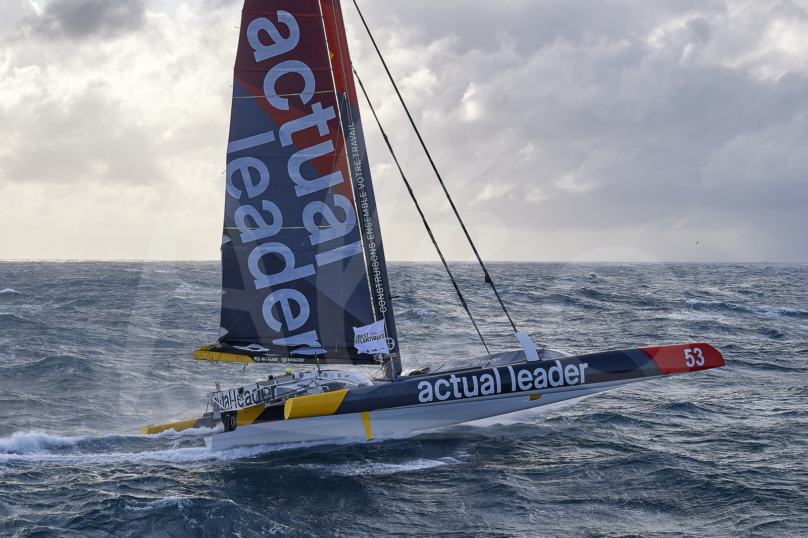 Description | BREST, FRANCE - NOVEMBER 05: Actual Leader is taking the start of the Brest Atlantiques duo sailing race on November 5, 2019 in Brest, France. Brest Atlantiques is reserved to Class Ultim 32/23, from Brest to Brest, via waypoints off Rio de Janeiro and Cape Town, without any stop. (Photo by Yvan Zedda/Alea) |