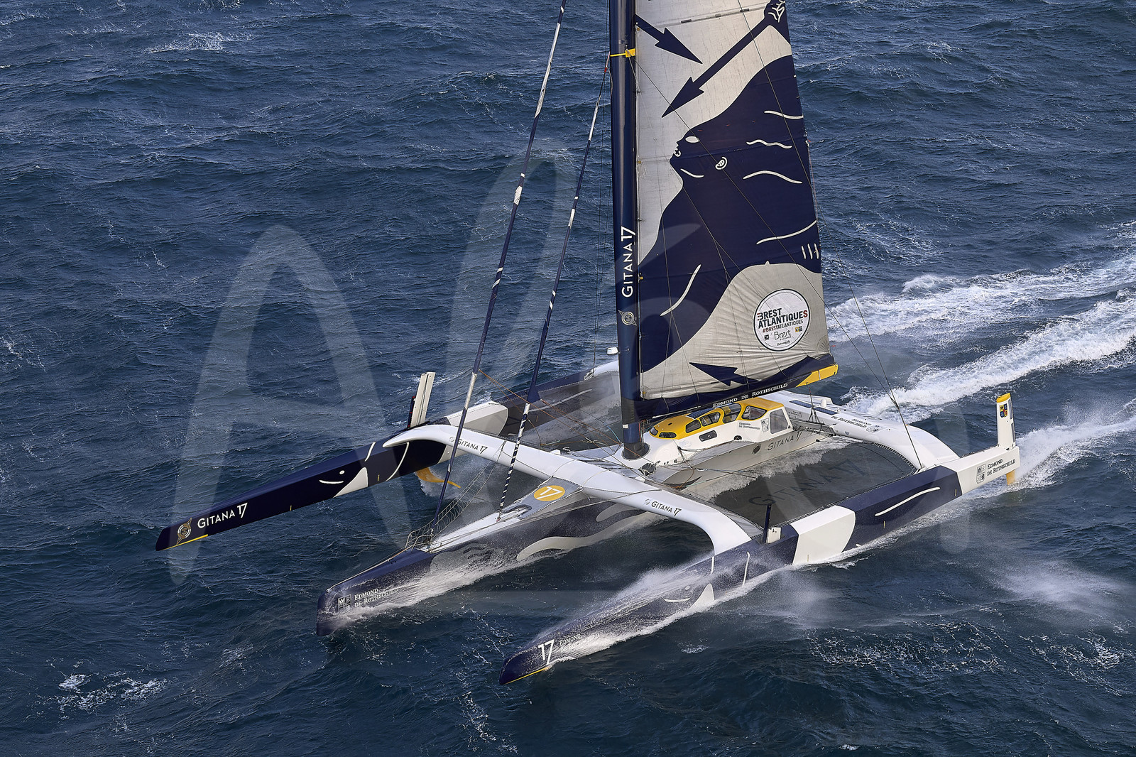 Description | BREST, FRANCE - NOVEMBER 05: Maxi Edmond de Rothschild is taking the start of the Brest Atlantiques duo sailing race on November 5, 2019 in Brest, France. Brest Atlantiques is reserved to Class Ultim 32/23, from Brest to Brest, via waypoints off Rio de Janeiro and Cape Town, without any stop. (Photo by Yvan Zedda/Alea) |