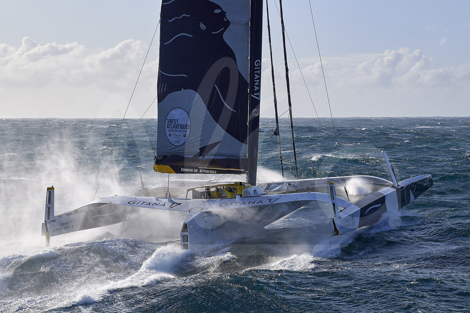 Description | BREST, FRANCE - NOVEMBER 05: Maxi Edmond de Rothschild skippers Franck Cammas and Charles Caudrelier, and mediaman Yann Riou are busy while taking the start of the Brest Atlantiques duo sailing race on November 5, 2019 in Brest, France. Brest Atlantiques is reserved to Class Ultim 32/23, from Brest to Brest, via waypoints off Rio de Janeiro and Cape Town, without any stop. (Photo by Yvan Zedda/Alea) |