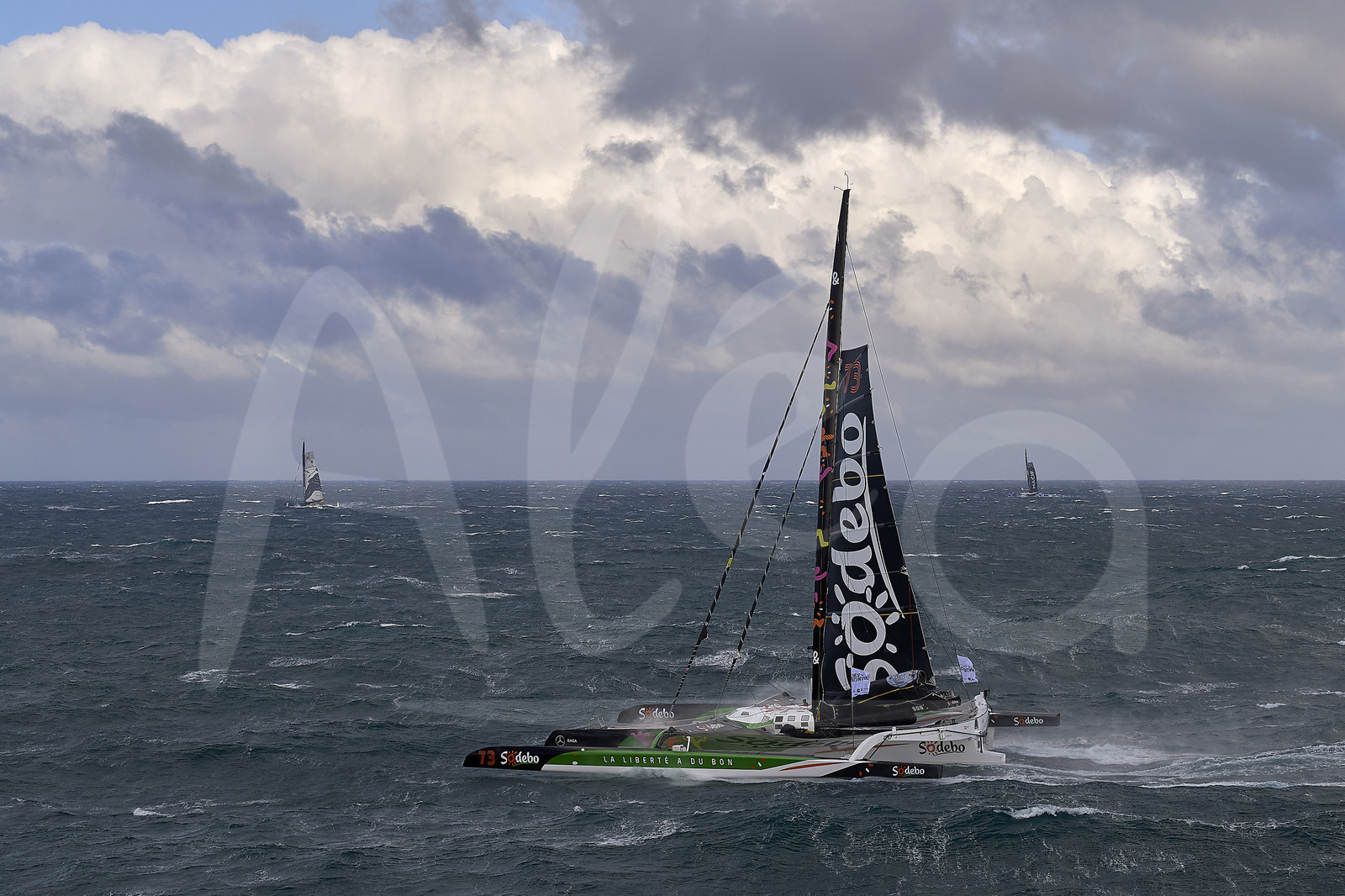 Description | BREST, FRANCE - NOVEMBER 05: Sodebo Ultim 3, Maxi Edmond de Rothschild and Trimaran MACIF in the background are taking the start of the Brest Atlantiques duo sailing race on November 5, 2019 in Brest, France. Brest Atlantiques is reserved to Class Ultim 32/23, from Brest to Brest, via waypoints off Rio de Janeiro and Cape Town, without any stop. (Photo by Yvan Zedda/Alea) |