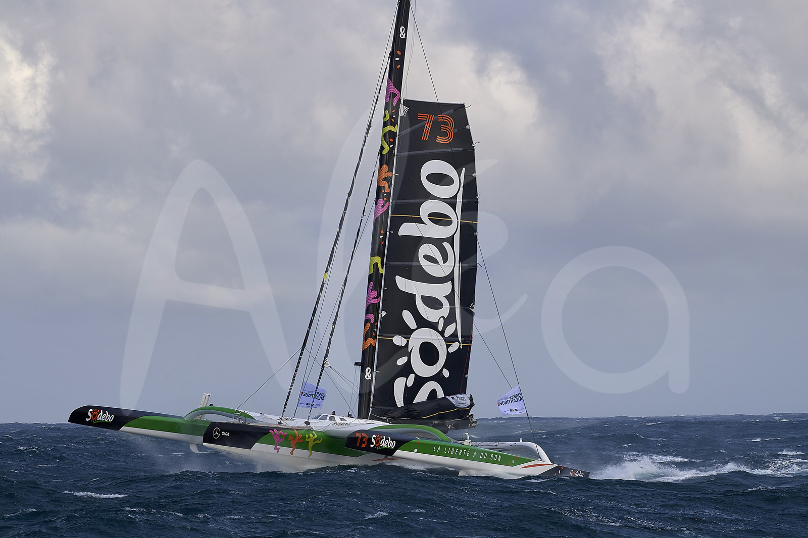 Description | BREST, FRANCE - NOVEMBER 05: Sodebo Ultim 3 is taking the start of the Brest Atlantiques duo sailing race on November 5, 2019 in Brest, France. Brest Atlantiques is reserved to Class Ultim 32/23, from Brest to Brest, via waypoints off Rio de Janeiro and Cape Town, without any stop. (Photo by Yvan Zedda/Alea) |