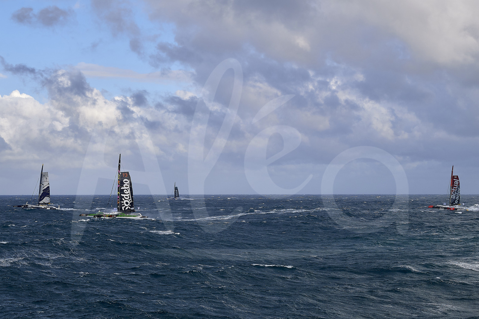 Description | BREST, FRANCE - NOVEMBER 05: The four Ultims Sodebo Ultim 3, Actual Leader, Maxi Edmond de Rothschild and Trimaran MACIF are taking the start of the Brest Atlantiques duo sailing race on November 5, 2019 in Brest, France. Brest Atlantiques is reserved to Class Ultim 32/23, from Brest to Brest, via waypoints off Rio de Janeiro and Cape Town, without any stop. (Photo by Yvan Zedda/Alea) |