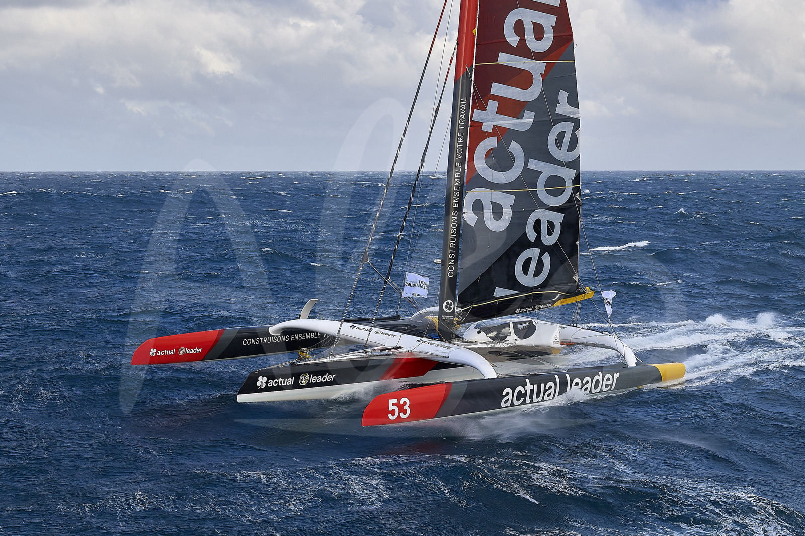 Description | BREST, FRANCE - NOVEMBER 05: Actual Leader and Sodebo Ultim 3 are taking the start of the Brest Atlantiques duo sailing race on November 5, 2019 in Brest, France. Brest Atlantiques is reserved to Class Ultim 32/23, from Brest to Brest, via waypoints off Rio de Janeiro and Cape Town, without any stop. (Photo by Yvan Zedda/Alea) |