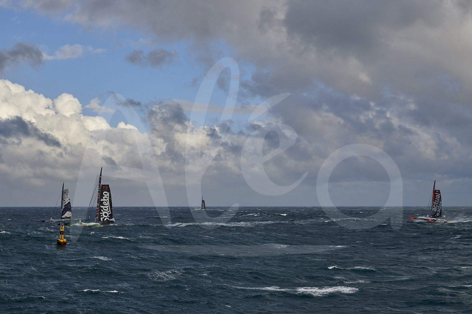 Description | BREST, FRANCE - NOVEMBER 05: The four Ultims Sodebo Ultim 3, Actual Leader, Maxi Edmond de Rothschild and Trimaran MACIF are taking the start of the Brest Atlantiques duo sailing race on November 5, 2019 in Brest, France. Brest Atlantiques is reserved to Class Ultim 32/23, from Brest to Brest, via waypoints off Rio de Janeiro and Cape Town, without any stop. (Photo by Yvan Zedda/Alea) |