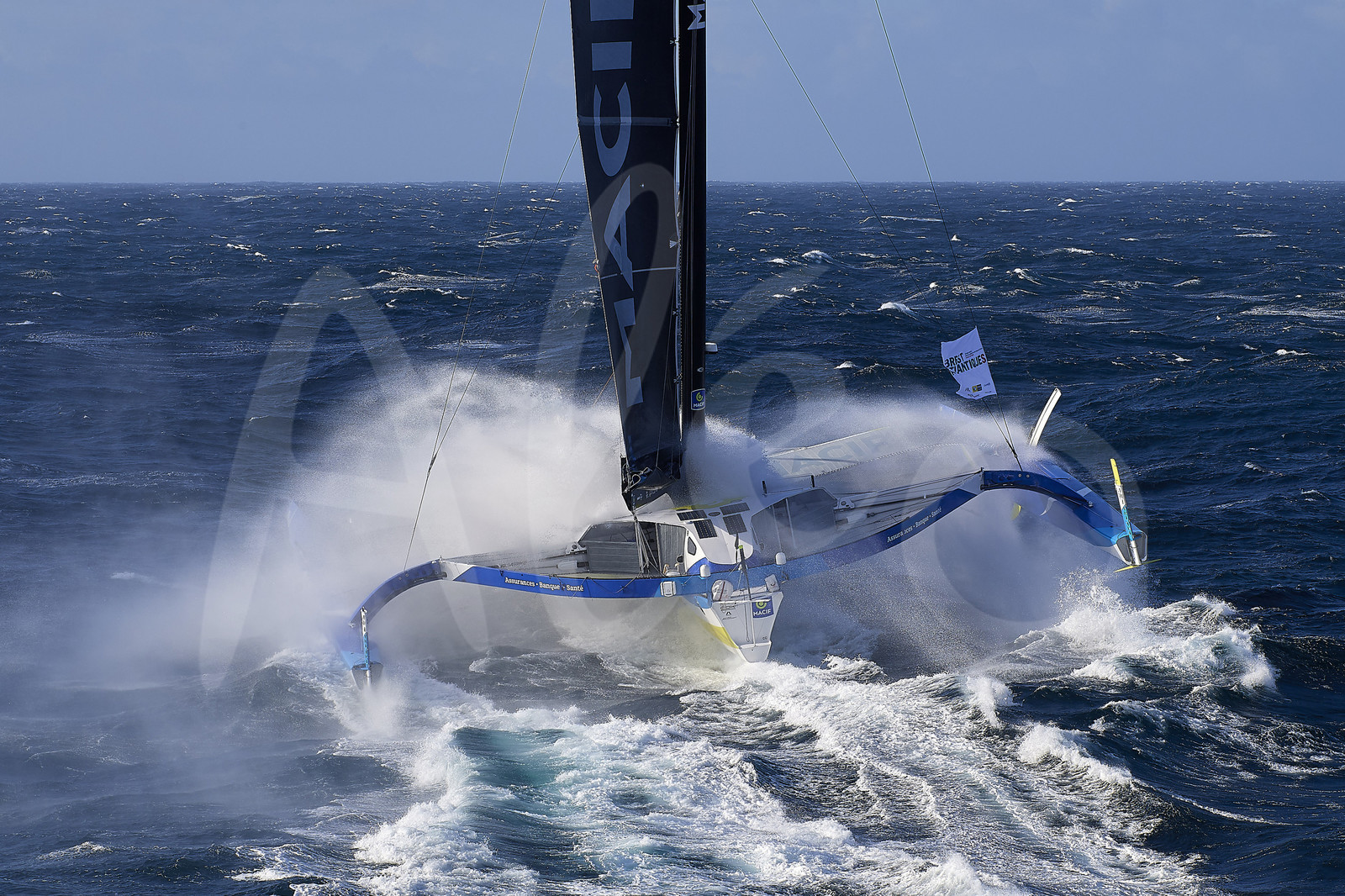 Description | BREST, FRANCE - NOVEMBER 05: Trimaran MACIF is taking the start of the Brest Atlantiques duo sailing race on November 5, 2019 in Brest, France. Brest Atlantiques is reserved to Class Ultim 32/23, from Brest to Brest, via waypoints off Rio de Janeiro and Cape Town, without any stop. (Photo by Yvan Zedda/Alea) |