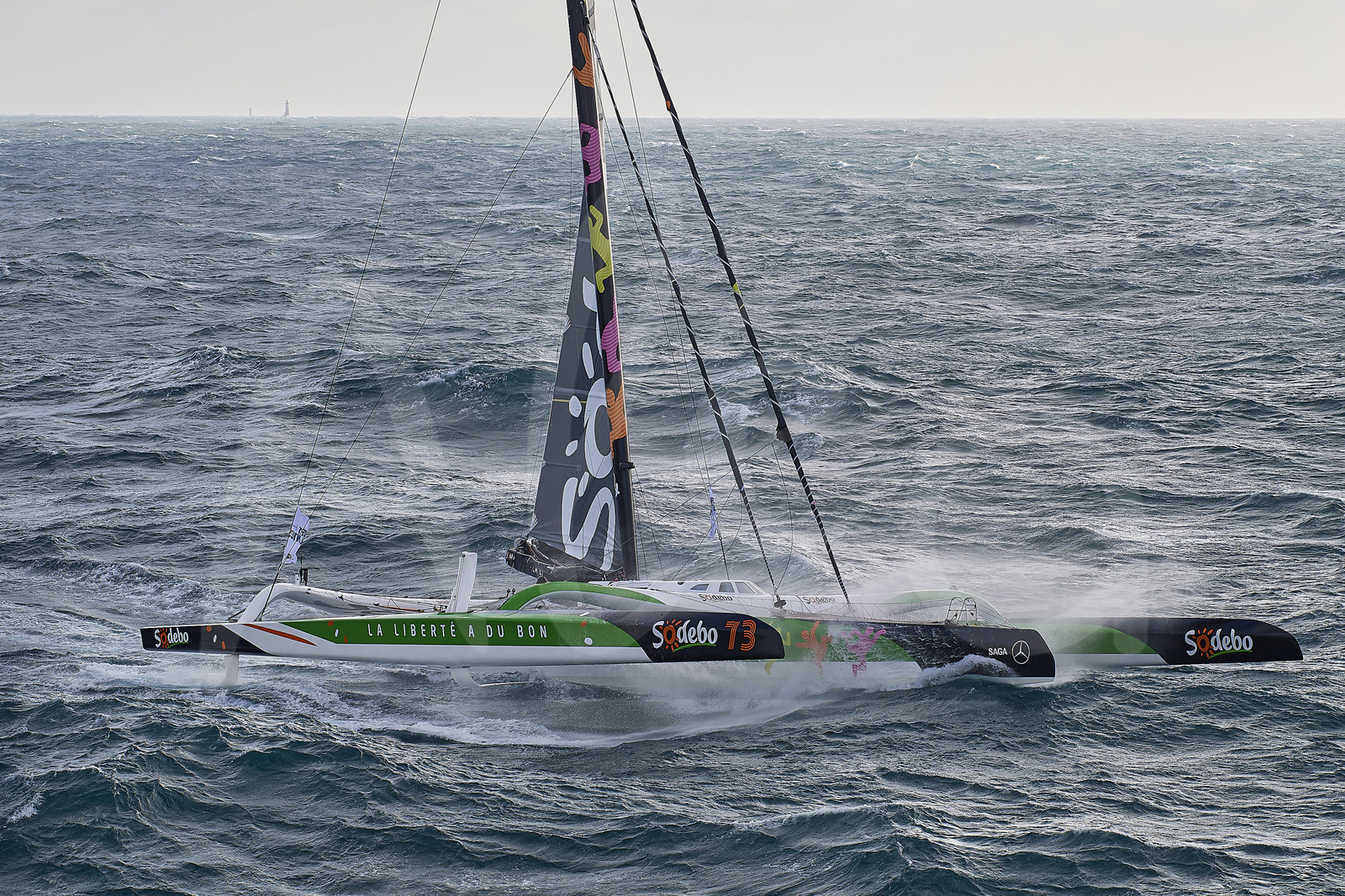 Description | BREST, FRANCE - NOVEMBER 05: Sodebo Ultim 3 is taking the start of the Brest Atlantiques duo sailing race on November 5, 2019 in Brest, France. Brest Atlantiques is reserved to Class Ultim 32/23, from Brest to Brest, via waypoints off Rio de Janeiro and Cape Town, without any stop. (Photo by Yvan Zedda/Alea) |