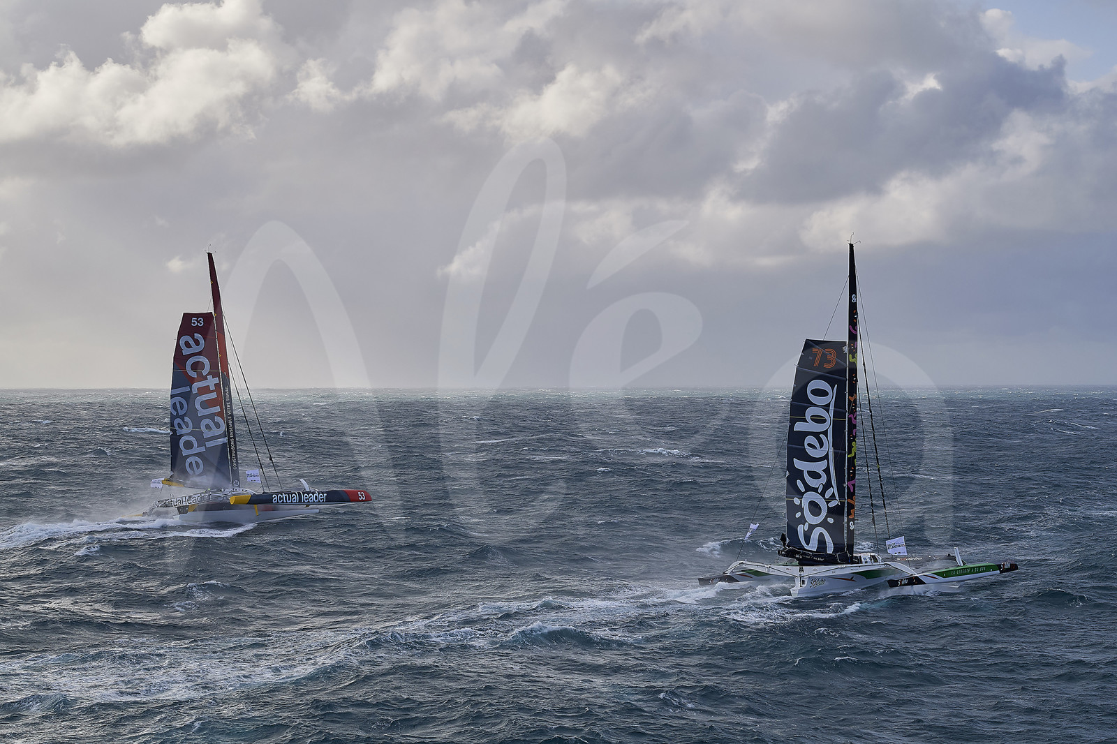 Description | BREST, FRANCE - NOVEMBER 05: Actual Leader and Sodebo Ultim 3 are taking the start of the Brest Atlantiques duo sailing race on November 5, 2019 in Brest, France. Brest Atlantiques is reserved to Class Ultim 32/23, from Brest to Brest, via waypoints off Rio de Janeiro and Cape Town, without any stop. (Photo by Yvan Zedda/Alea) |