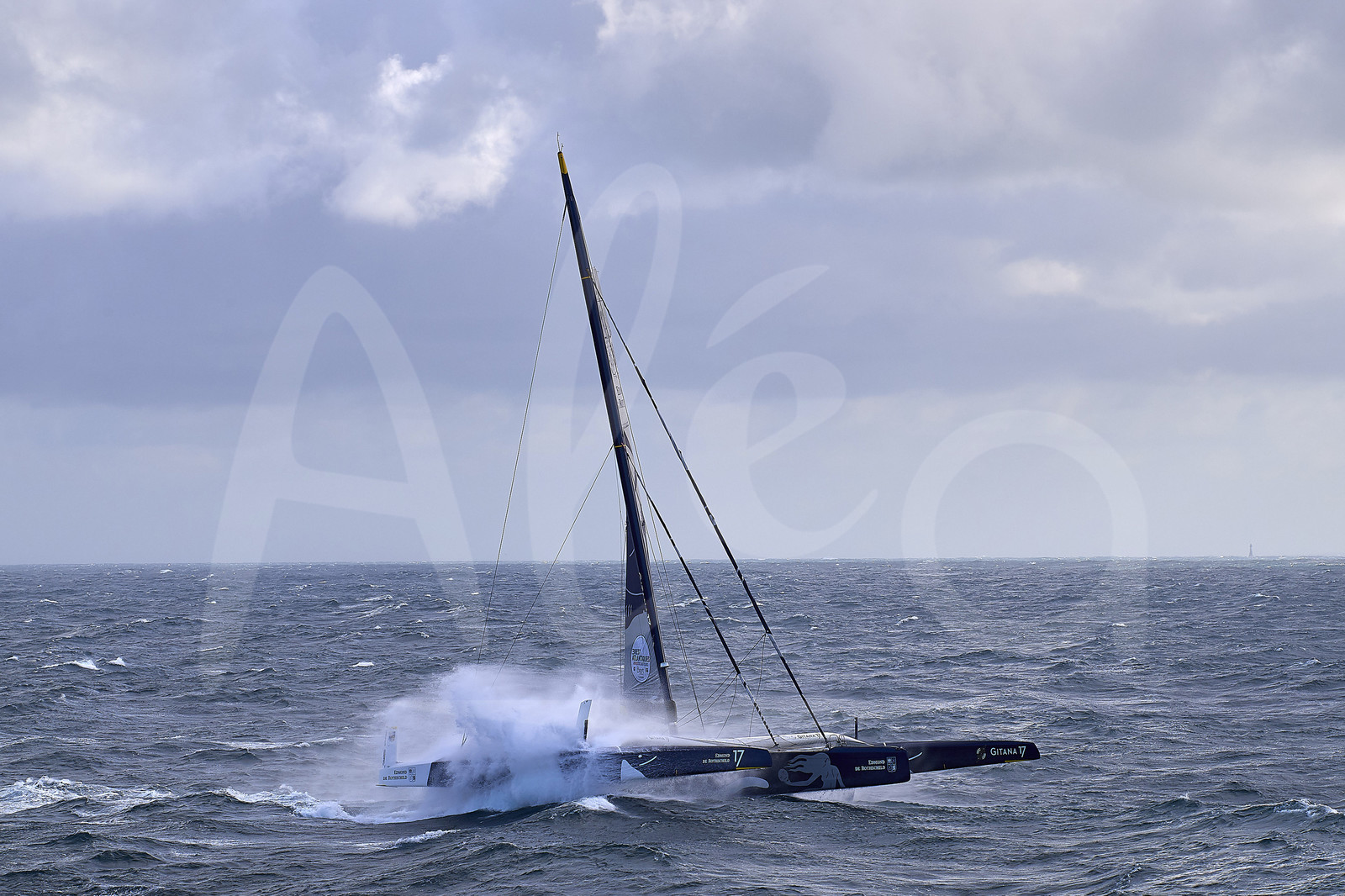 Description | BREST, FRANCE - NOVEMBER 05: Maxi Edmond de Rothschild is taking the start of the Brest Atlantiques duo sailing race on November 5, 2019 in Brest, France. Brest Atlantiques is reserved to Class Ultim 32/23, from Brest to Brest, via waypoints off Rio de Janeiro and Cape Town, without any stop. (Photo by Yvan Zedda/Alea) |