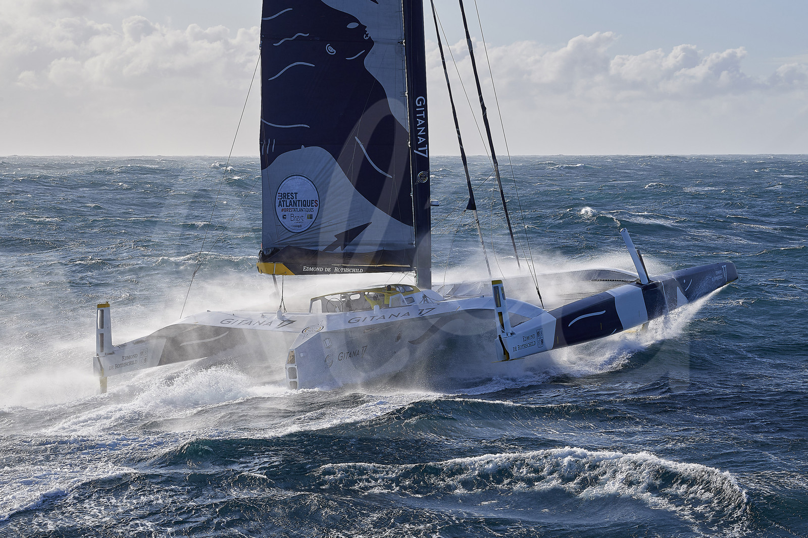 Description | BREST, FRANCE - NOVEMBER 05: Maxi Edmond de Rothschild is taking the start of the Brest Atlantiques duo sailing race on November 5, 2019 in Brest, France. Brest Atlantiques is reserved to Class Ultim 32/23, from Brest to Brest, via waypoints off Rio de Janeiro and Cape Town, without any stop. (Photo by Yvan Zedda/Alea) |