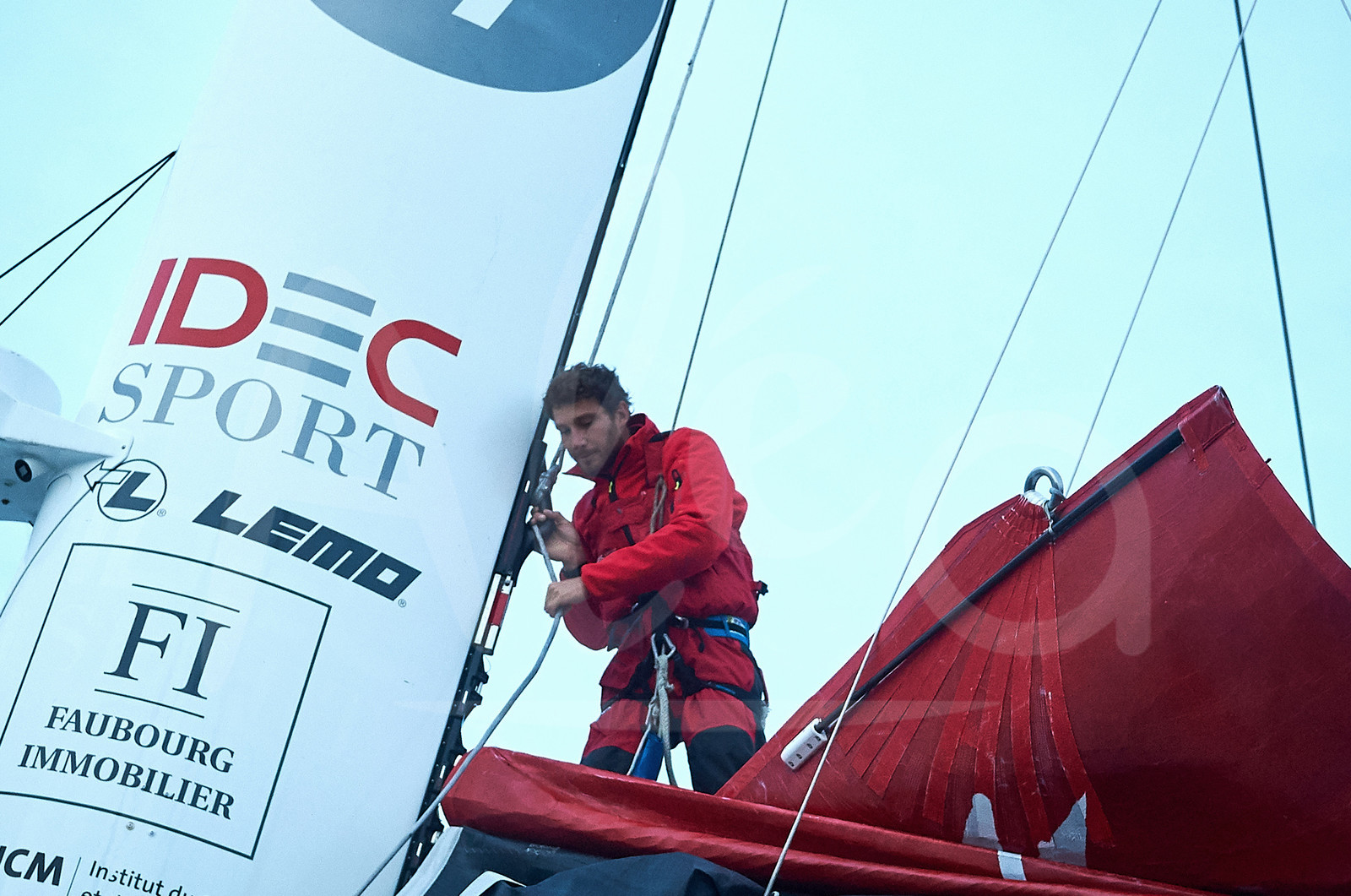 | Description | LA TRINITE SUR MER, FRANCE - OCTOBER 19: IDEC Sport maxi trimaran crew member Corentin Joyon helps French skipper Francis Joyon to begin his Asian Tour with "La Mauricienne" record breaking attempt from Port Louis, South Brittany, to Port Louis, Mauritius, on October 19, 2019, in La Trinite sur Mer, France. (Photo by Martin Coudriet/Alea) |