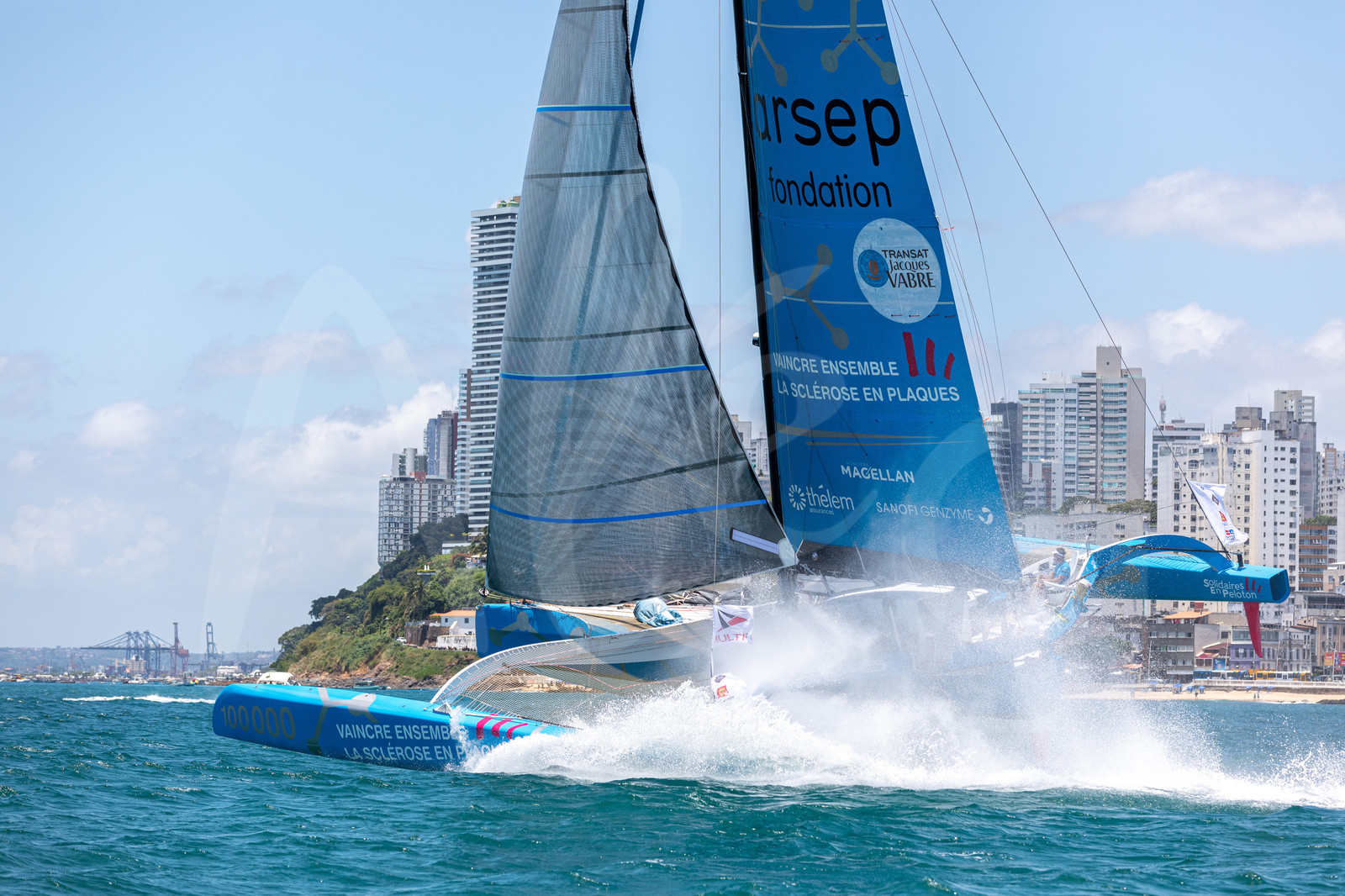 Description | SALVADOR DE BAHIA, BRAZIL - NOVEMBER 8: Solidaires en Peloton - Arsep skippers Thibault Vauchel-Camus and Fred Duthil take second place in the Multi 50 category of the Transat Jacques Vabre 2019 on November 8, 2019 in Bahia, Brazil. Transat Jacques Vabre is a transatlantic duo sailing race from Le Havre, France, to Salvador de Bahia, Brazil. (Photo by Jean-Marie Liot/ALeA) |