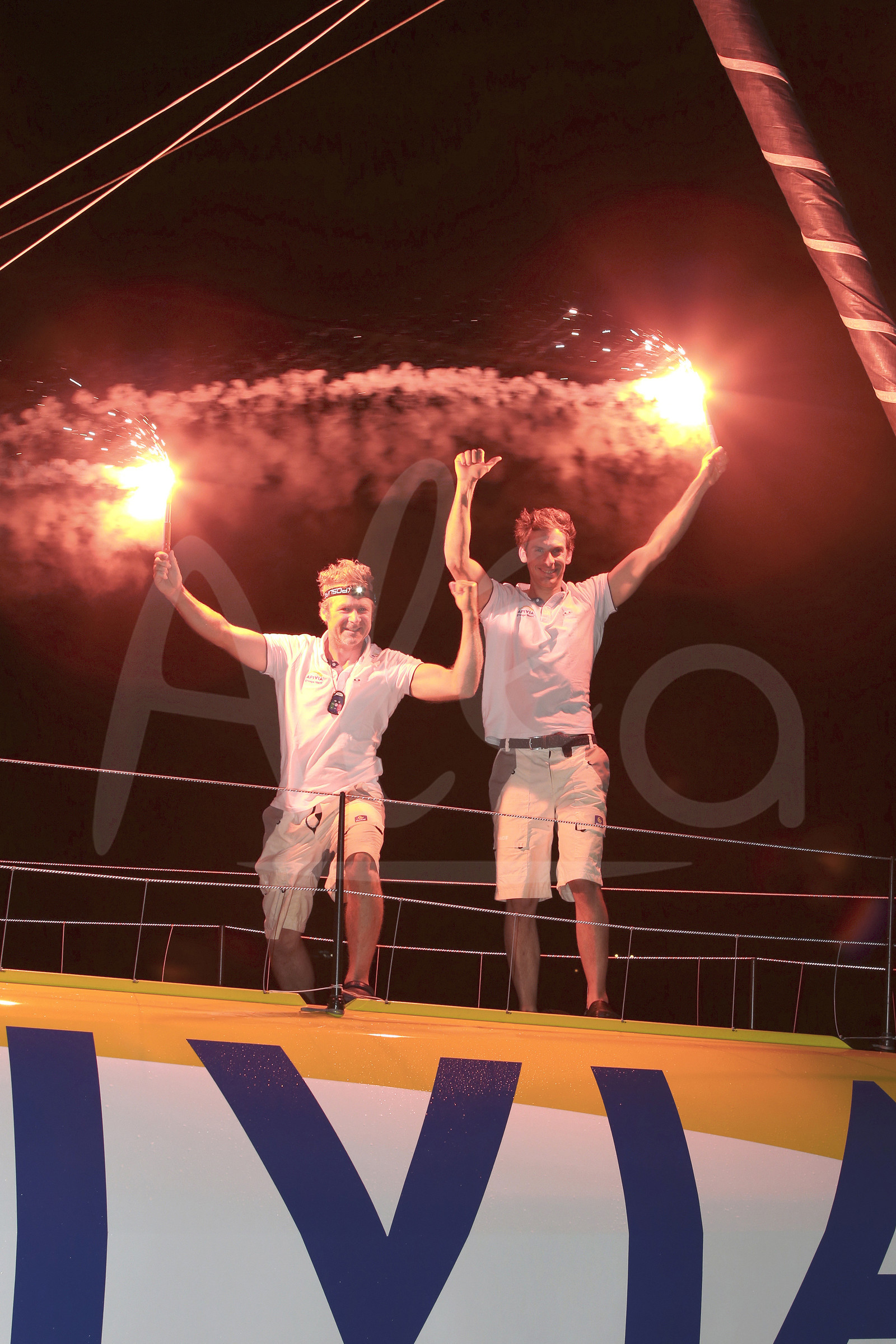 Description | SALVADOR DE BAHIA, BRAZIL - NOVEMBER 10: Apivia skippers Charlie Dalin and Yann Elies celebrate with flares winning the Imoca category of the Transat Jacques Vabre 2019 on November 10, 2019 in Bahia, Brazil. Transat Jacques Vabre is a duo sailing race from Le Havre, France, to Salvador de Bahia, Brazil. (Photo by Jean-Marie Liot/Alea) |