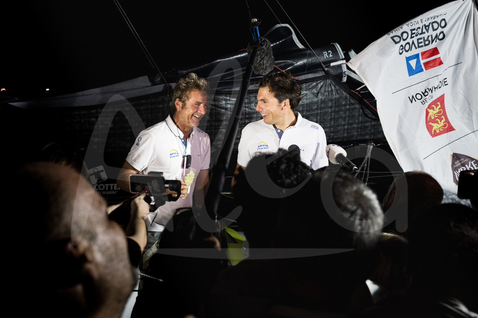 Description | SALVADOR DE BAHIA, BRAZIL - NOVEMBER 10: Apivia skippers Charlie Dalin and Yann Elies talk to media at pontoon after winning the Imoca category of the Transat Jacques Vabre 2019 on November 10, 2019 in Bahia, Brazil. Transat Jacques Vabre is a duo sailing race from Le Havre, France, to Salvador de Bahia, Brazil. (Photo by Jean-Louis Carli/Alea) |
