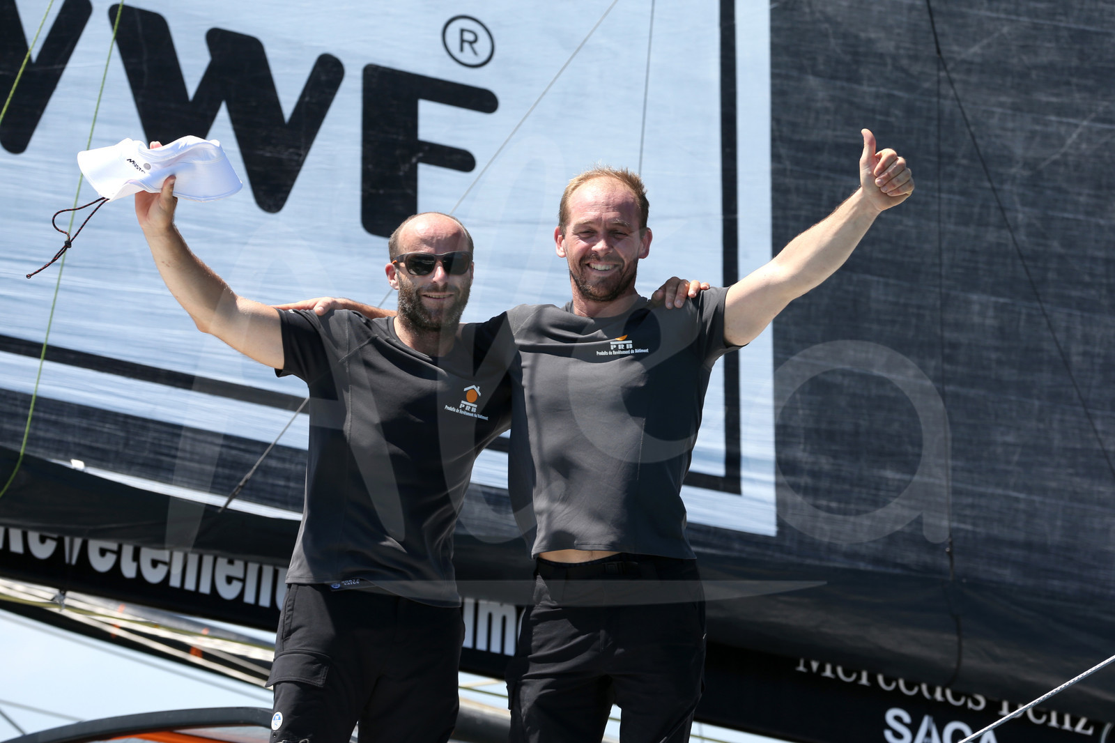 Description | SALVADOR DE BAHIA, BRAZIL - NOVEMBER 10: PRB skippers Kevin Escoffier and Nicolas Lunven celebrate taking 2nd place of the Imoca category of the Transat Jacques Vabre 2019 on November 10, 2019 in Bahia, Brazil. Transat Jacques Vabre is a duo sailing race from Le Havre, France, to Salvador de Bahia, Brazil. (Photo by Jean-Marie Liot/Alea) |