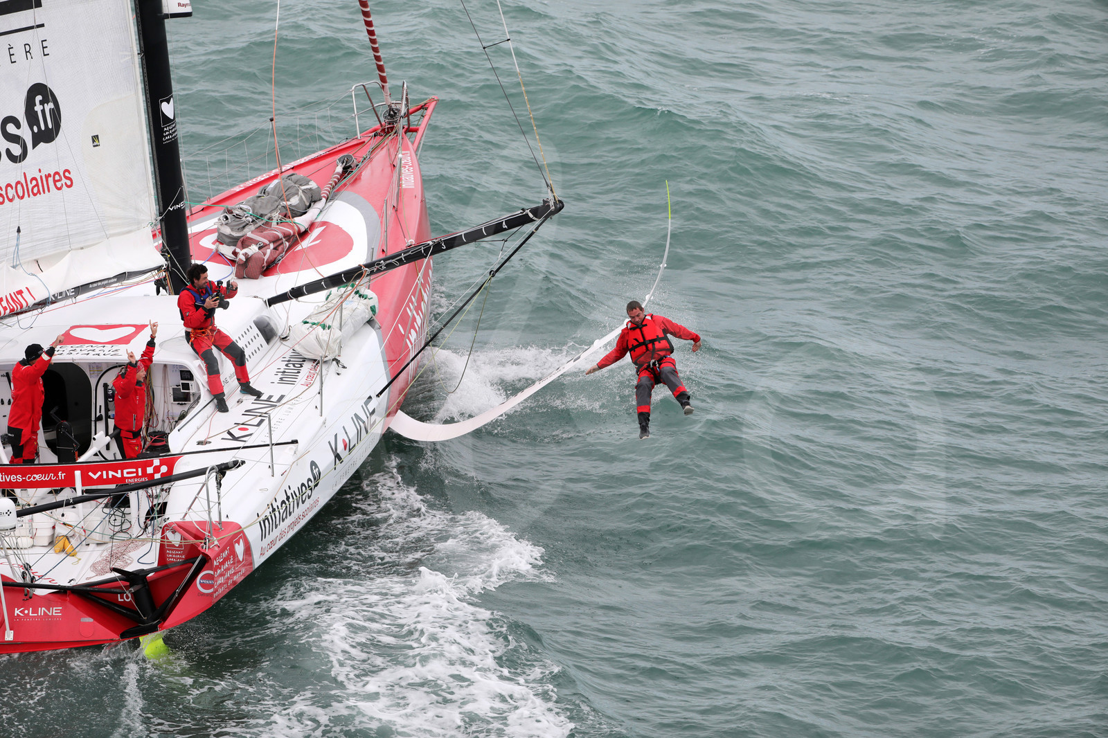 Description | LE HAVRE, FRANCE - OCTOBER 27: A crew member of Imoca Initiatives Coeur is jumping into the water from the outrigger to leave the boat prior to the start of the Transat Jacques Vabre 2019, duo sailing race from Le Havre, France, to Salvador de Bahia, Brazil, on October 27, 2019 in Le Havre, France. (Photo by Jean-Marie Liot/Alea) |