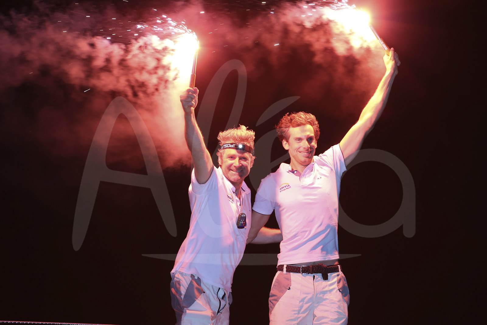 Description | SALVADOR DE BAHIA, BRAZIL - NOVEMBER 10: Apivia skippers Charlie Dalin and Yann Elies celebrate with flares winning the Imoca category of the Transat Jacques Vabre 2019 on November 10, 2019 in Bahia, Brazil. Transat Jacques Vabre is a duo sailing race from Le Havre, France, to Salvador de Bahia, Brazil. (Photo by Jean-Marie Liot/Alea) |